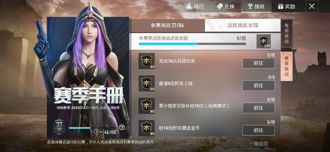 除了每周挑战外,赛季挑战特种兵们也千万别忘了哦!分别有参赛挑战与活跃挑战两个部分,全部完成也能获取大量的手册积分!