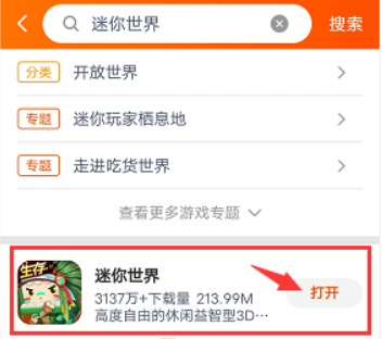 点击,输入“迷你世界”。找到迷你世界并打开游戏