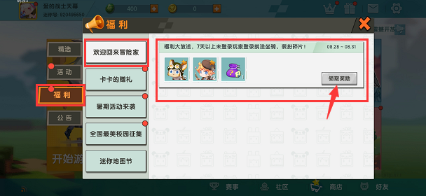 在游戏主界面中,点击礼物()图标,找到“福利”模块,第一个“欢迎回来冒险家”就是啦!点击领取之后相应的奖励可以在仓库中查看哦~