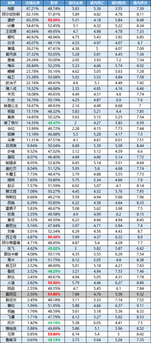 哈喽,欢迎观看《曙光英雄》英雄周榜!在这周的数据中,最让人津津乐道的自然就是新英雄露西亚了,露西亚凭借着高机动性和高伤害,直冲胜率榜的第二名!场均击杀也来到了恐怖的7.88,位列全英雄第一!胜率不进倒数第一就算赢的花荣,在经过几个版本的加强后,这次胜率排到了第三名,同时火莲也罕见入榜;伏羲作为没上线多久的英雄,登场率来到了第四名!胜率也不低。