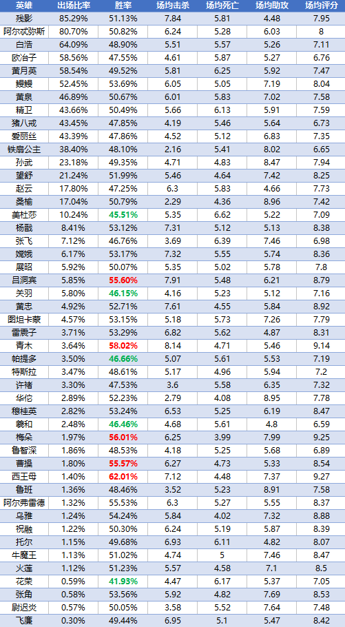 注:此榜单按出场率由高到低排序,标红为胜率前5的英雄,标绿为胜率排名倒数的英雄