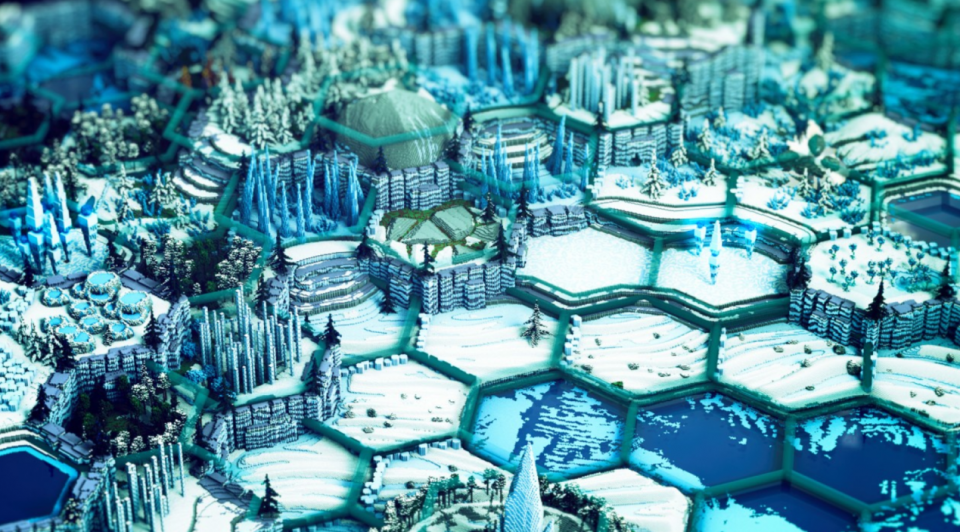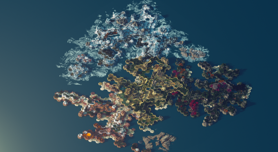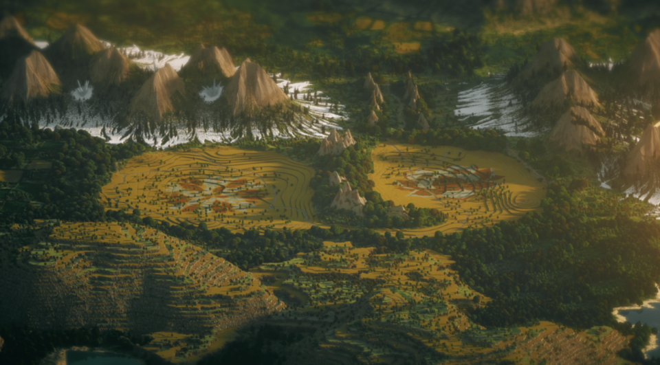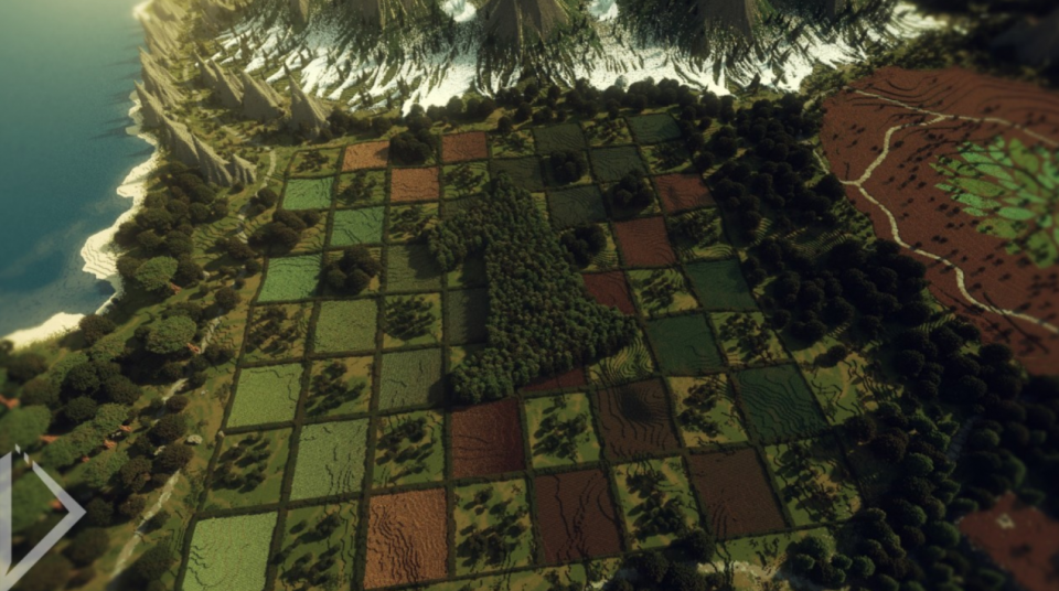 这里就不再单纯玩光的魔法了,虽然整个画面能从弧度较大的地势上看出方块的痕迹,但好在茂盛的植物遮去了这一瑕疵。