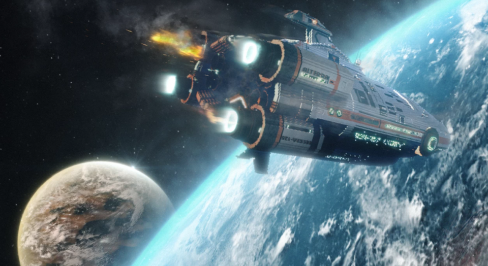 这个简直就是教科书般的光影使用了,第一眼谁不会误会是什么科幻电影的海报?在细节上也非常精致,这个飞船完美融入了星球背景,方块痕迹也非常浅。