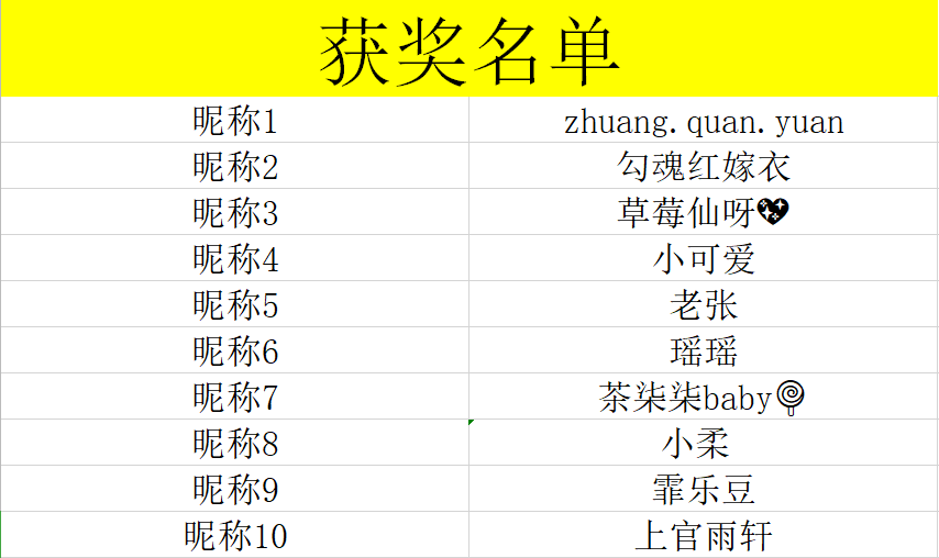 让我们恭喜:zhuang.quan.yuan、勾魂红嫁衣、草莓仙呀💖、小可爱、老张、瑶瑶、茶柒柒baby🍭、小柔、霏乐豆、上官雨轩10位玩家中奖!