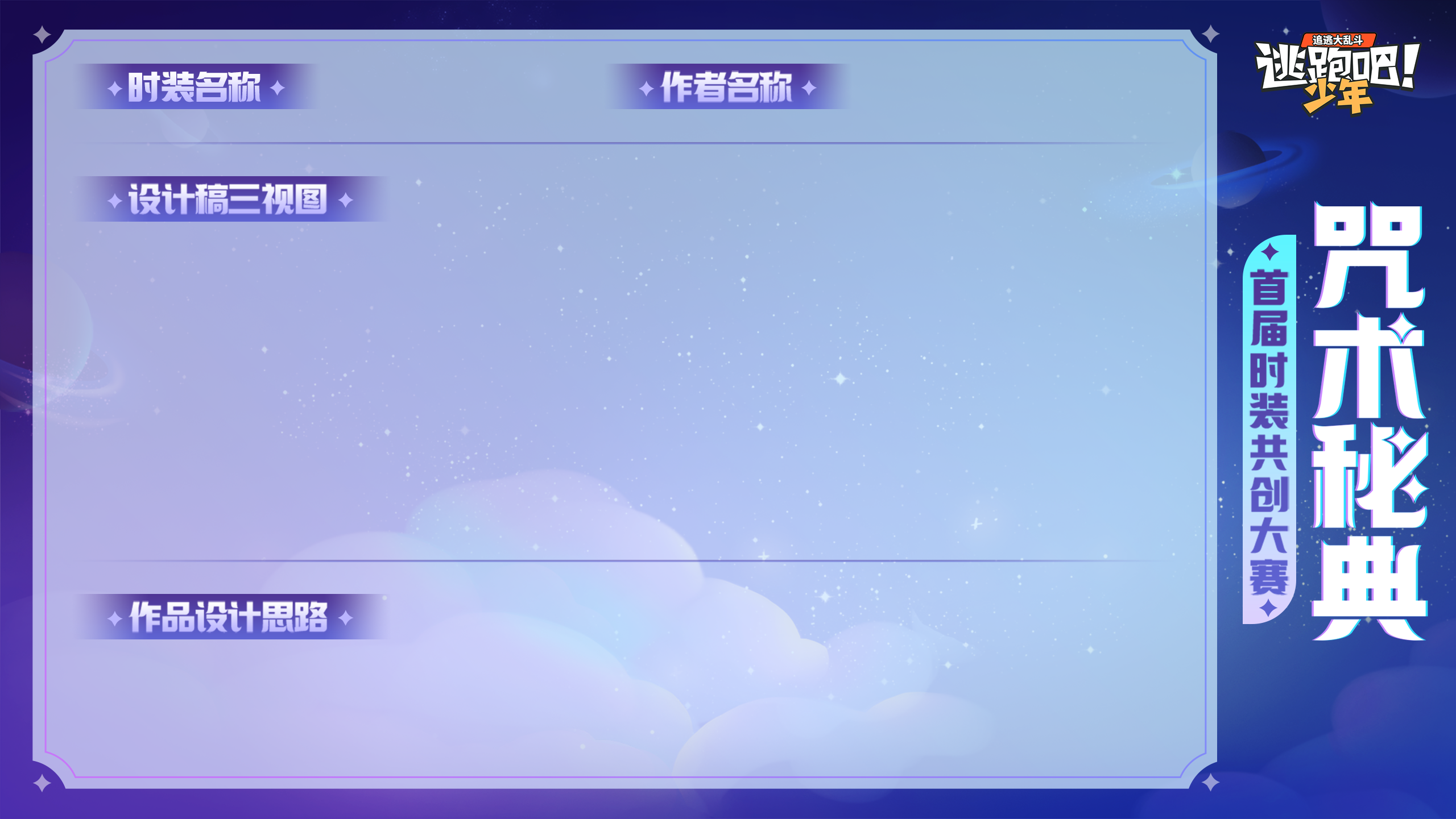 参赛的少年们可以在社区带上话题【咒术秘典】发帖投稿,发帖内容需要包含游戏平台+游戏数字ID+作品,作品需使用固定模板投稿,包含皮肤名称、作者名称、设计稿三视图、作品设计思路四个因素,作者需要将作品放在模板对应区域。