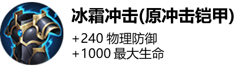 唯一主动-冲击:朝敌人移动时增加50%移速,减少600范围内敌人30%移速和攻速,1.5秒后对400范围内敌人造成0.5秒冰冻,若目标移速或攻速受损(低于初始值),则分别追加0.5秒冰冻。冷却时间:90秒。