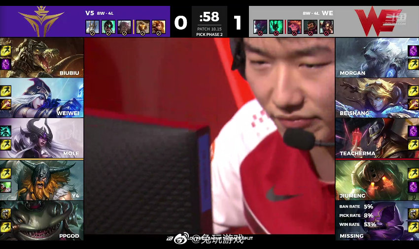 【2020LPL夏季赛 WE 1-0 V5】V5这场给Biubiu拿到了鳄鱼;WE最后给Morgan拿了凯南针对Biubiu的鳄鱼。#来斗鱼看lpl夏季赛# #2020LPL#