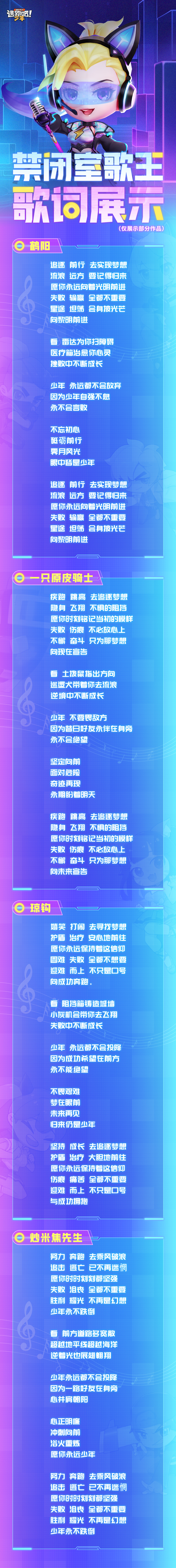 前不久我们举办了禁闭室鸽(歌)王的活动,小学妹真的听到了好多少年们的歌声!也收到了很多少年们对于歌词的二创~