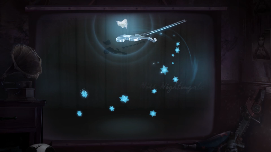 一把残破的银色小提琴和一个面具浮现空中