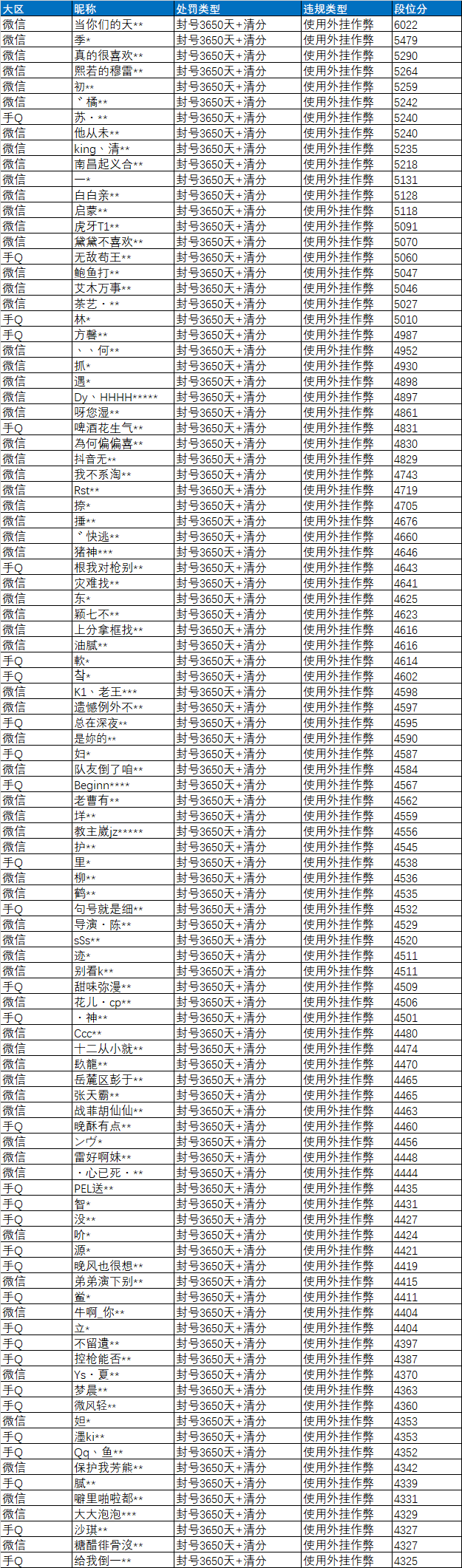 近期部分使用外挂违规特种兵名单: