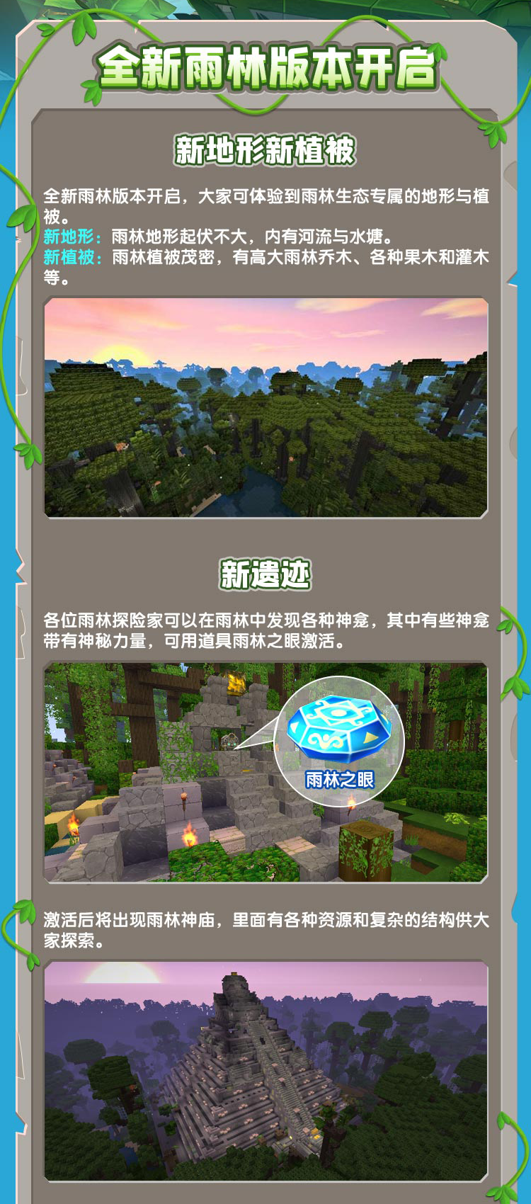 迷你世界正式服0.51.0更新公告。一直以来,《迷你世界》的创造者们在这片大陆上创造着一个又一个的奇迹。本次正式服更新了雨林版本,一起来看看吧!