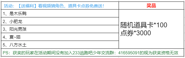 请以上获奖的5位玩家三天内在233逃跑吧少年交流群内联系管理员:233+肚子圆滚滚(备注逃跑吧少年904活动兑换)进行兑换