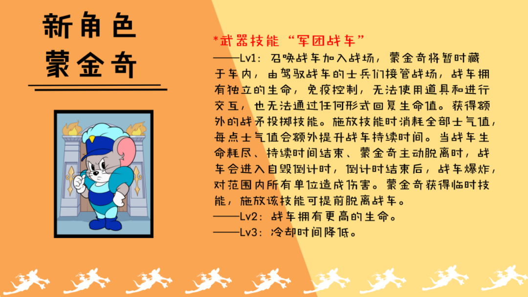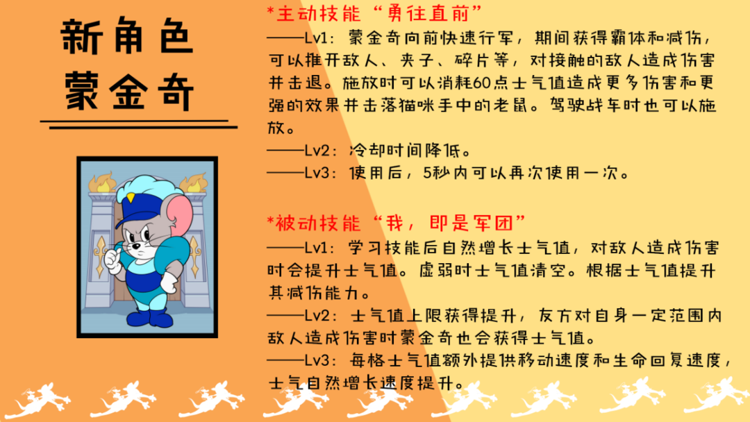 ——Lv1:蒙金奇向前快速行军,期间获得霸体和减伤,可以推开敌人、夹子、碎片等,对接触的敌人造成伤害并击退。施放时可以消耗60点士气值造成更多伤害和更强的效果并击落猫咪手中的老鼠。驾驶战车时也可以施放。