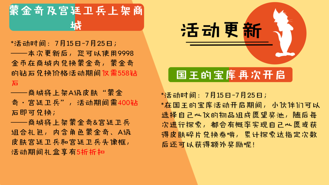 *商城将上架蒙金奇&宫廷卫兵组合礼包,内含角色蒙金奇、A级皮肤宫廷卫兵和宫廷卫兵头像框,礼包的钻石兑换价格1598,活动期间礼盒享有5折折扣,钻石兑换折扣价仅需799,购买礼包更划算哟~