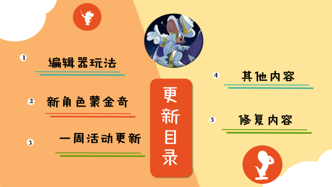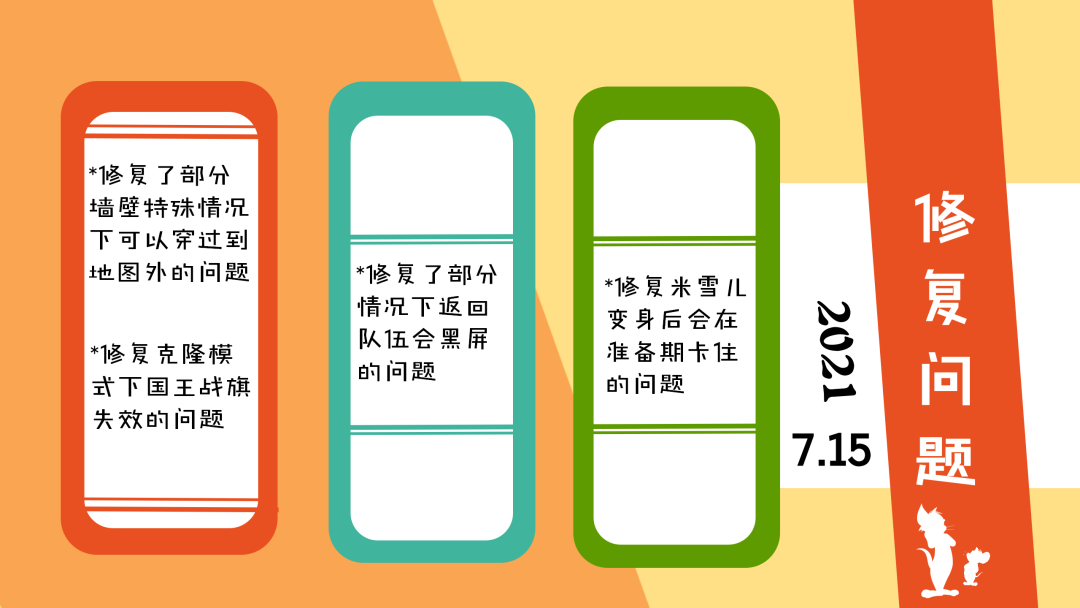 我们的《猫和老鼠》手游已于今天(7月15日)09:30-10:30,进行了不停服更新。本次更新不会影响小伙伴们正常进行游戏,维护期间可能会出现部分网络波动问题,请大家谅解。