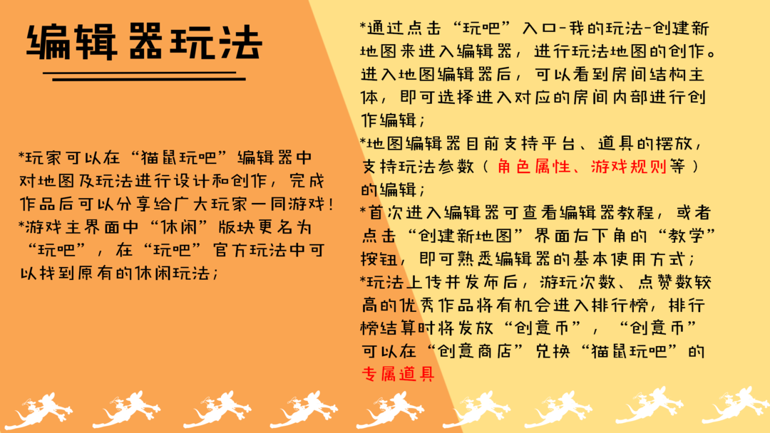 *玩法上传并发布后,游玩次数、点赞数较高的优秀作品将有机会进入排行榜,排行榜结算时将发放“创意币”,“创意币”可以在“创意商店”兑换“猫鼠玩吧”的专属道具!
