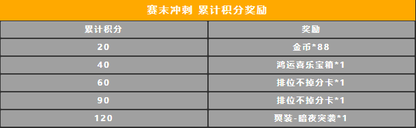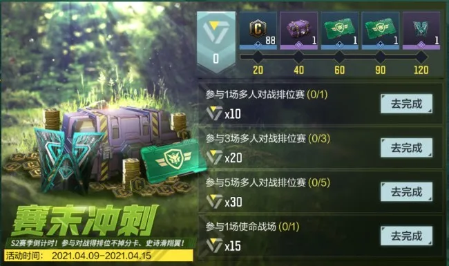 4月9日开启的赛末冲刺活动,战士们只要完成相应的对局任务,即能获得积分奖励,兑换金币、鸿运喜乐宝箱、翼装-暗夜突袭,以及众战士垂涎已久的排位不掉分卡!