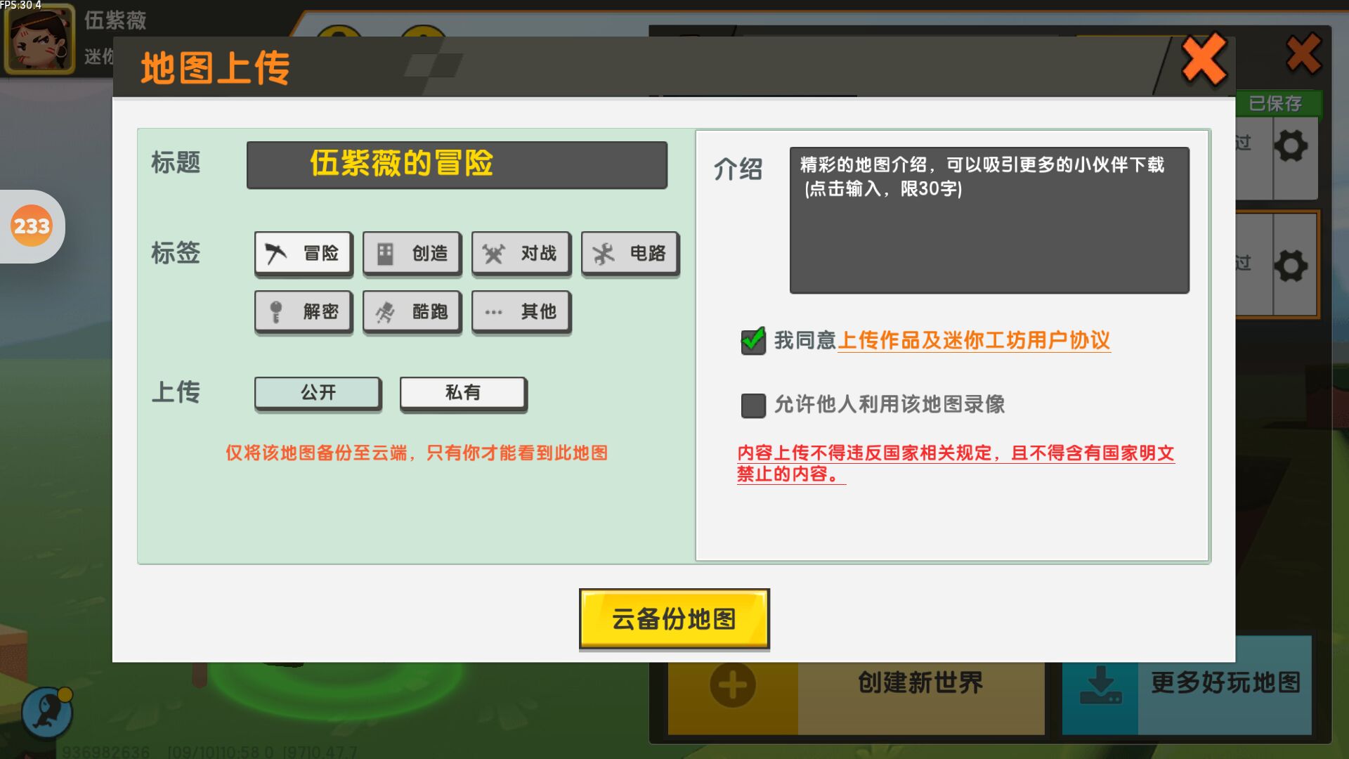 1、打开迷你世界(旧版本),点击地图边上的设置,然后点击地图上传