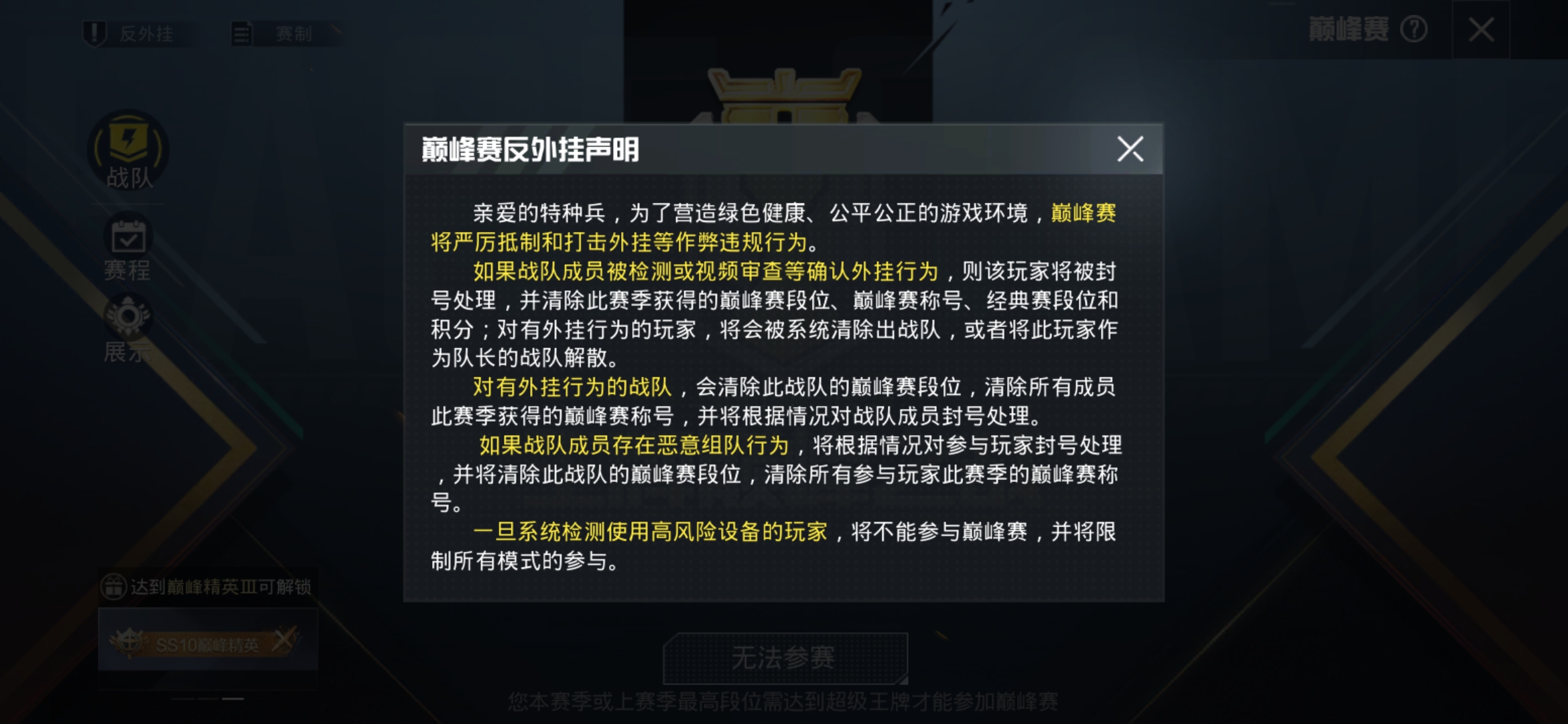 为了营造绿色健康、公平公正的游戏环境,巅峰赛将严厉抵制和打击外挂等作弊违规行为,让作弊违规者无处遁形!