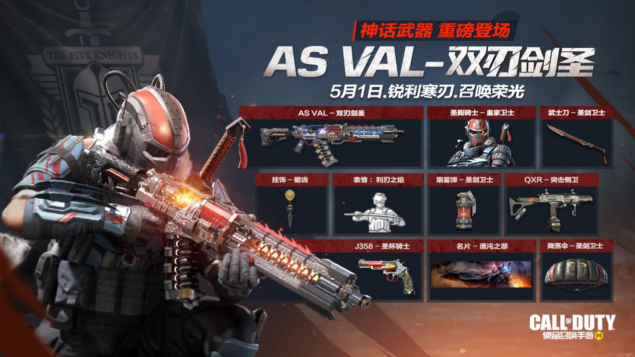 利刃出鞘之日,神话再临之时。5月1日,圣殿骑士携手神话级突击步枪AS VAL-双刃剑圣,正式抵达战场,新的战争即将打响,战士们请做好准备!