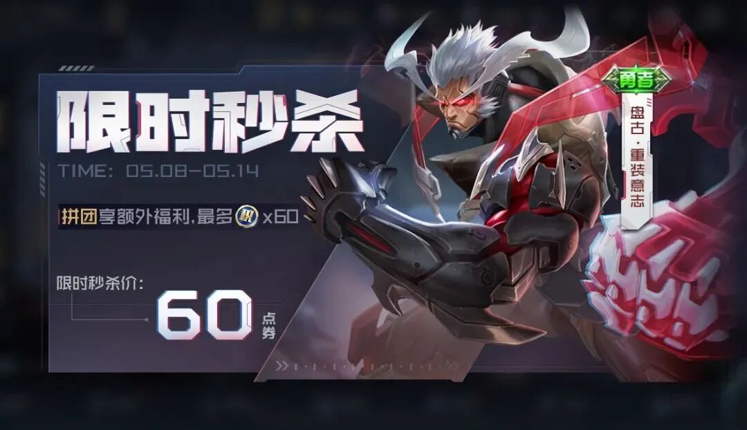“限时秒杀盘古-重装意志”活动开启,60点券即可购买盘古-重装意志皮肤并发起拼团,拼团享额外福利,2人即可成团,拼团人数达5人,全员可得60荣耀积分。
