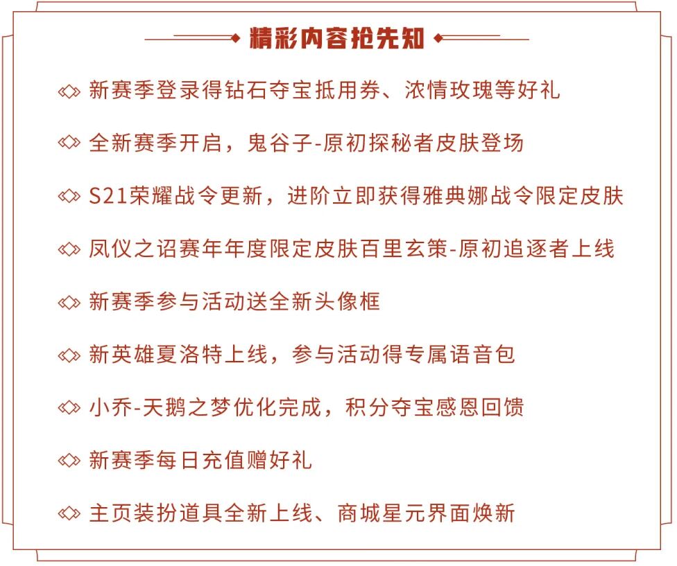 S21新赛季开启,意味着荣耀战令也将进入全新赛季。战令新赛季开启后,所有玩家登录游戏即可免费激活全新版本的荣耀战令-精英版,上赛季的战令等级和进阶状态会进行重置(包括精英版和进阶版,战令币不会被清空),同时部分战令等级奖励和兑换商品也会进行更新,新赛季战令内容如下。