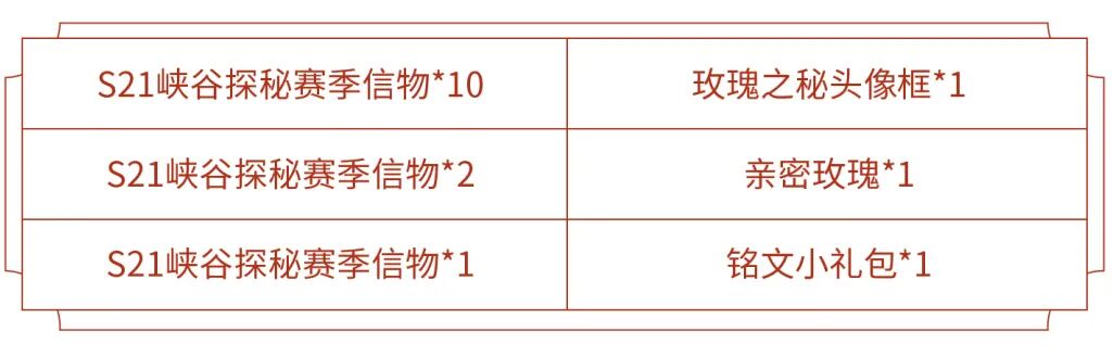 新赛季开启,参与活动提升分路战力、参与匹配/排位赛等可获得S21峡谷探秘赛季信物,使用信物可兑换全新玫瑰之秘头像框、亲密玫瑰等好礼。