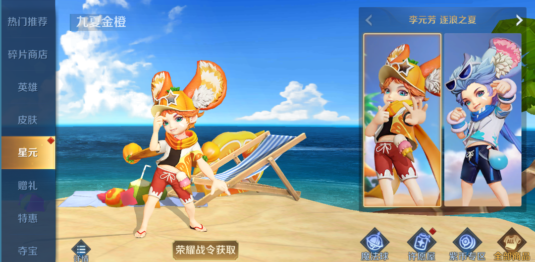 S21进阶版荣耀战令奖励——李元芳-九夏金橙星元皮肤一套,提升等级即可获得哦,本次3个部件为战令首发,其余部件后续将上架游戏商城,详情请查看官方公告~