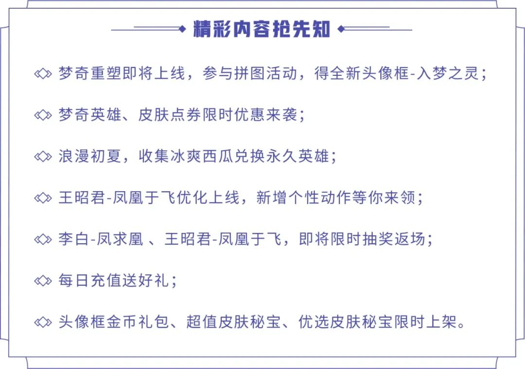 初夏豪华礼包:打开礼包可任意选择以下奖励之一,铭文碎片*600、战令币*80、战令经验*4000、紫星币*5