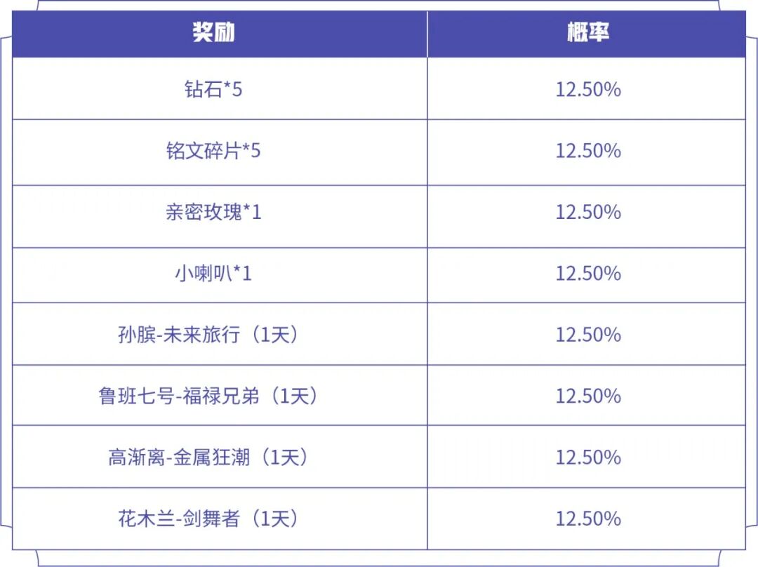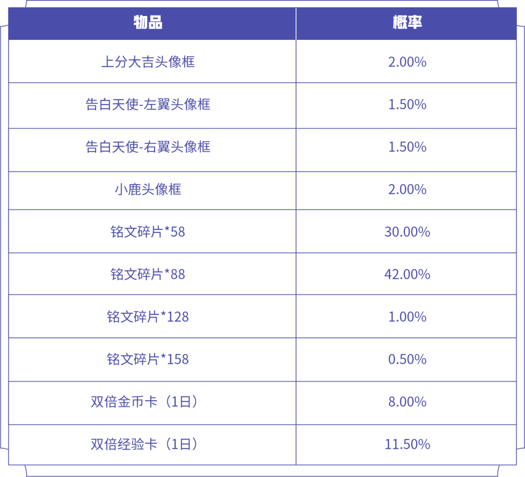 打开后可随机获得以下奖励之一,上分大吉头像框、告白天使-左翼头像框、告白天使-右翼头像框、小鹿头像框、双倍金币卡(1日)、双倍经验卡(1日)、铭文碎片*158/128/88/58。