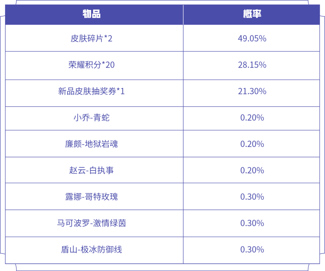 皮肤碎片&积分自选礼盒:打开礼包可任意选择以下奖励之一,荣耀积分*10或皮肤碎片*1