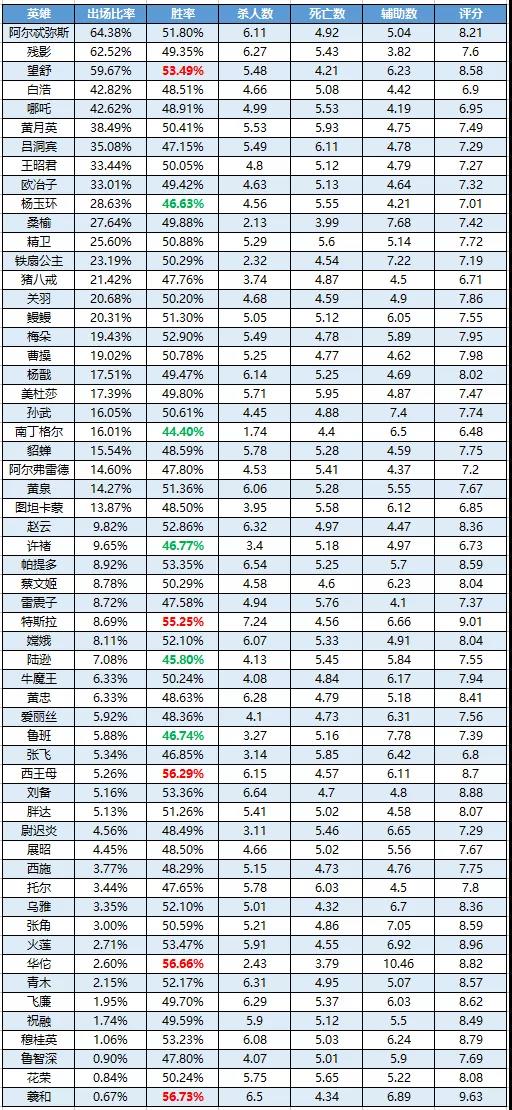 注:此榜单按出场率由高到低排序,标红为胜率前5的英雄,标绿为胜率排名倒数的英雄