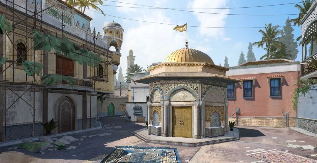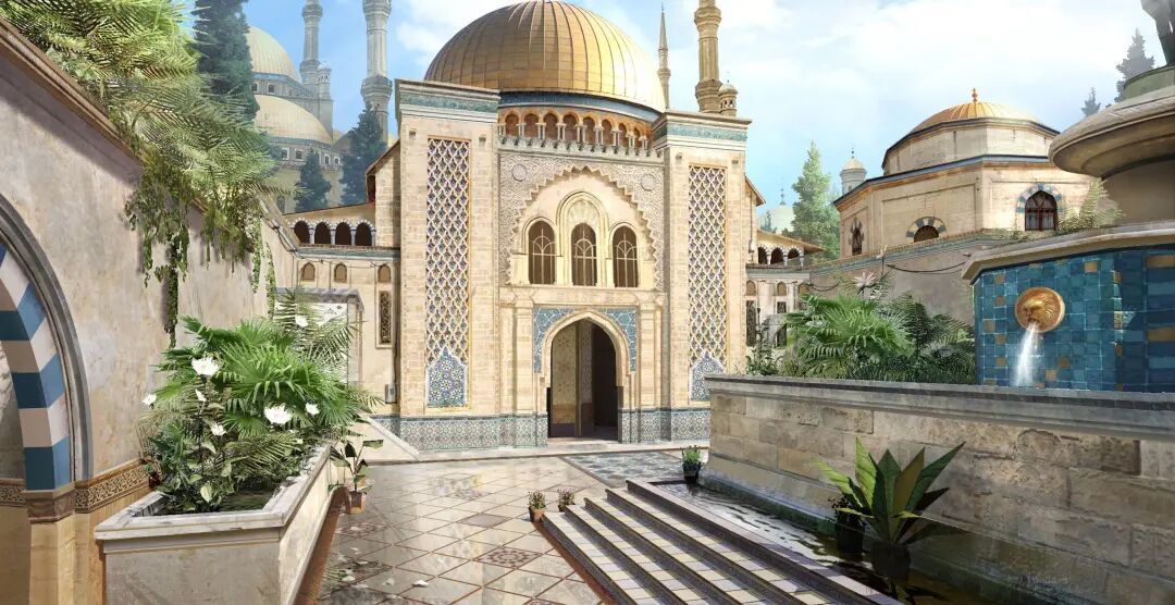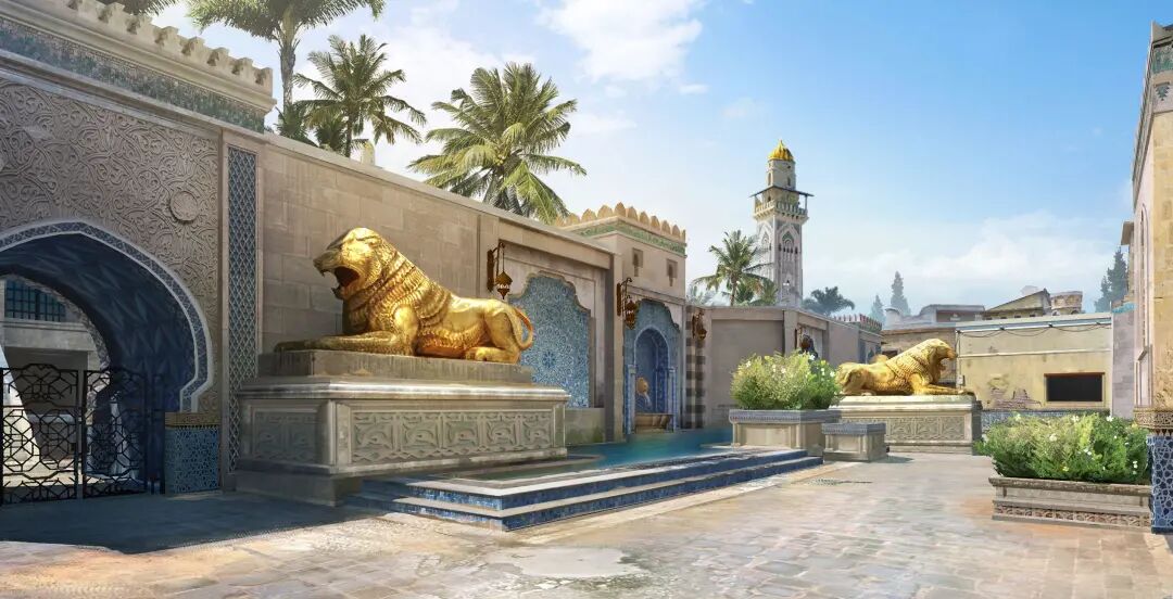 地图赛单第一站是富饶的绿洲,复古的印花与纯金的雕像似乎正共同述说着曾经的历史,但越是奢华之处,越有可能暗藏危机。绿洲地图整体较小,阻挡视线的掩体较多,巷道房间交错,主打的就是短兵相接的小规模战斗。