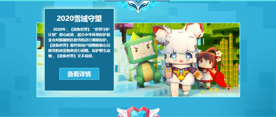 《迷你世界》联合中华环境保护基金会和瞳之初自然保护协会,对新疆地区的雪豹进行观察保护。活动期间,冒险家免费参与活动积累爱心81730490颗,已由《迷你世界》兑换为408652.45元的公益金,全数捐赠至中华环境保护基金会支持新疆地区雪豹专项保护工作,由瞳之初自然保护协会落实执行。