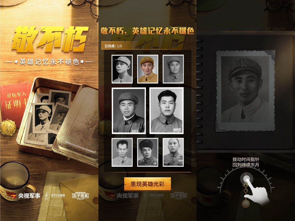 9月3日,中央电视台国防军事频道官方新媒体“央视军事”联合《和平精英》推出“敬不朽”——英雄记忆永不褪色互动H5活动。该活动以“修复老兵照片,传承老兵记忆”为主题,号召用户们为老兵翻新照片并生成致敬海报。