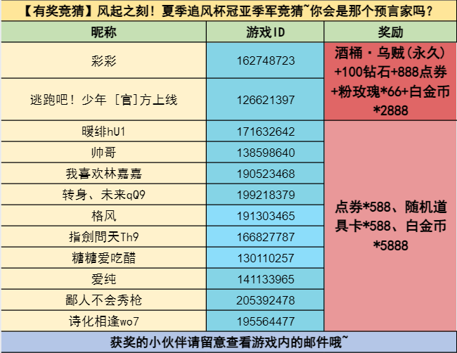 2.每个游戏ID只能领取超级预言家与新晋预言家其中之一的奖励(当符合获奖条件时,优先获得超级预言家)!