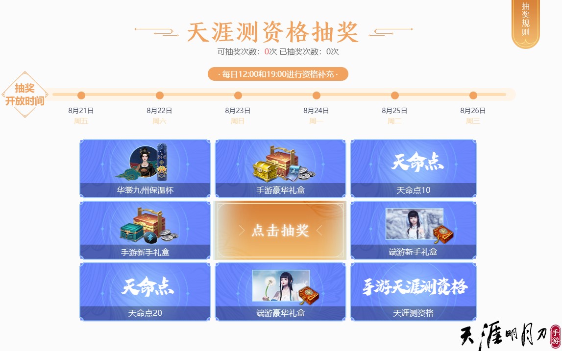 天涯测天命站抽奖于8月21日12:00开启,8月21-26日每日12:00、19:00都将对测试资格进行补充,各位少侠可前往官网天命站进行资格抽取,获得资格的玩家于8月31日进入第一批测试服务器【天涯服】体验测试。刀妹还准备了超丰厚周边与游戏限定礼包等少侠们带回家,即使抽不到资格也请少侠不要灰心哟~