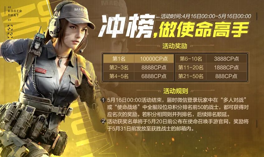 2、5月16日00:00活动结束,届时通过微信渠道登录,并在“多人对战”或“使命战场”中全服段位总积分排名前50的战士,都可获得对应名次的奖励。若积分相同则并列排名,后续排名顺延。