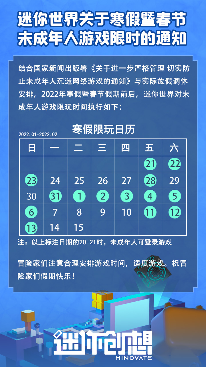 【公告】《迷你世界》关于寒假暨春节未成年人游戏限时的通知