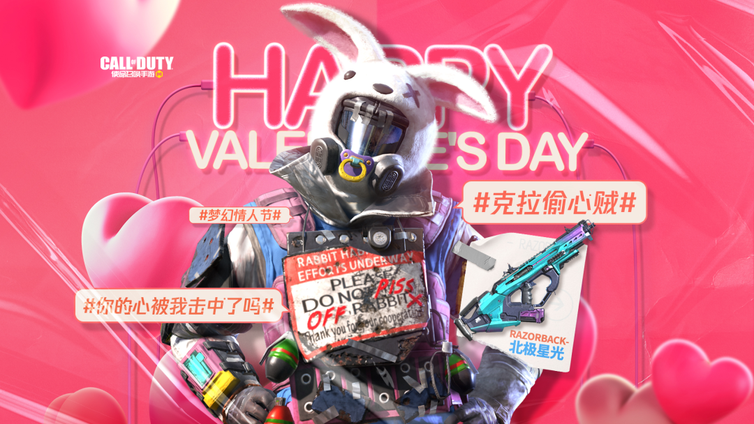而如今,在2月14日情人节这天,钢铁猛男火障头戴小兔兔,一身粉红,化身克拉偷心贼向各位战士“怦然”走来。