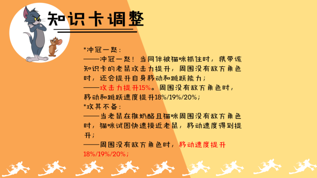 ——冲冠一怒!当同伴被猫咪抓住时,携带该知识卡的老鼠攻击力提升,周围没有敌方角色时,还会提升自身移动和跳跃能力;