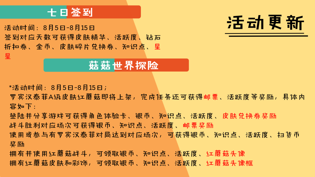 ——拥有红蘑菇皮肤和彩饰,可领取250银币、50知识点、100活跃度、红蘑菇头像框