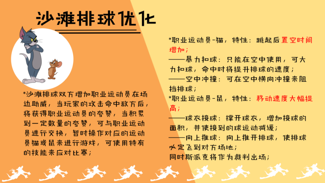 *沙滩排球双方增加职业运动员在场边助威,当玩家的攻击命中敌方后,将获得职业运动员的夸赞,当积累到一定数量的夸赞,可与职业运动员进行交换,暂时操作对应的运动员猫或鼠来进行游戏,可使用特有的技能来应对比赛;