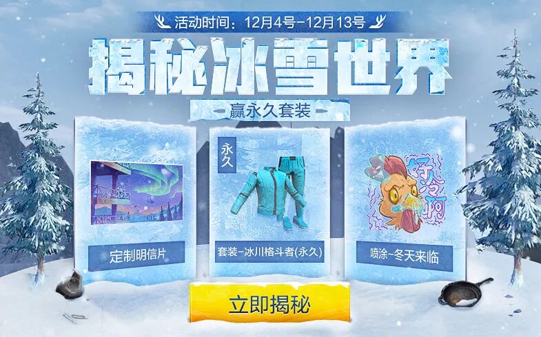 活动期间玩家通过登录游戏、分享活动可获取揭秘钥匙,钥匙可解锁冰雪世界,全部解锁后可获得永久冰雪传奇T恤,每解锁1次可抽奖,抽套装-冰川格斗者(永久)和最北邮局寄出的明信片。