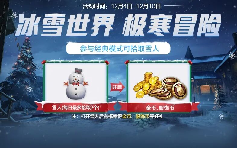 活动期间游戏内经典模式会掉落雪人宝箱(玩家每日最多可拾取2个),可带出大厅打开获得奖励。
