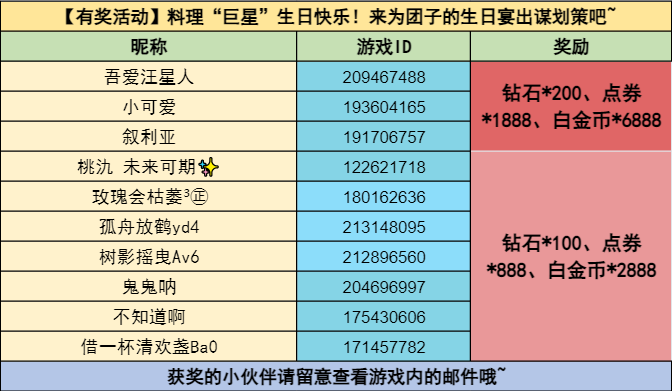 团子的神秘药膳(3名):钻石*200、点券*1888、白金币*6888