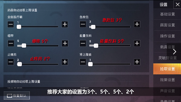 在诸多的药品中,全能医疗箱和肾上腺素是比较占空间的,但两者的作用都比较大,所以大家可以将它们的拾取上限设置为1个。