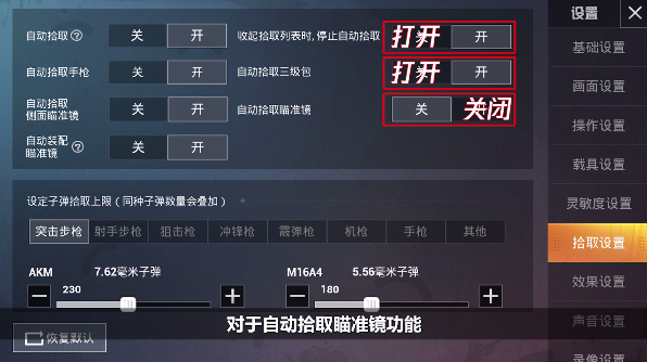 我们需要开启收起拾取列表时停止自动拾取、自动拾取三级包功能,并且关闭自动拾取瞄准镜功能。