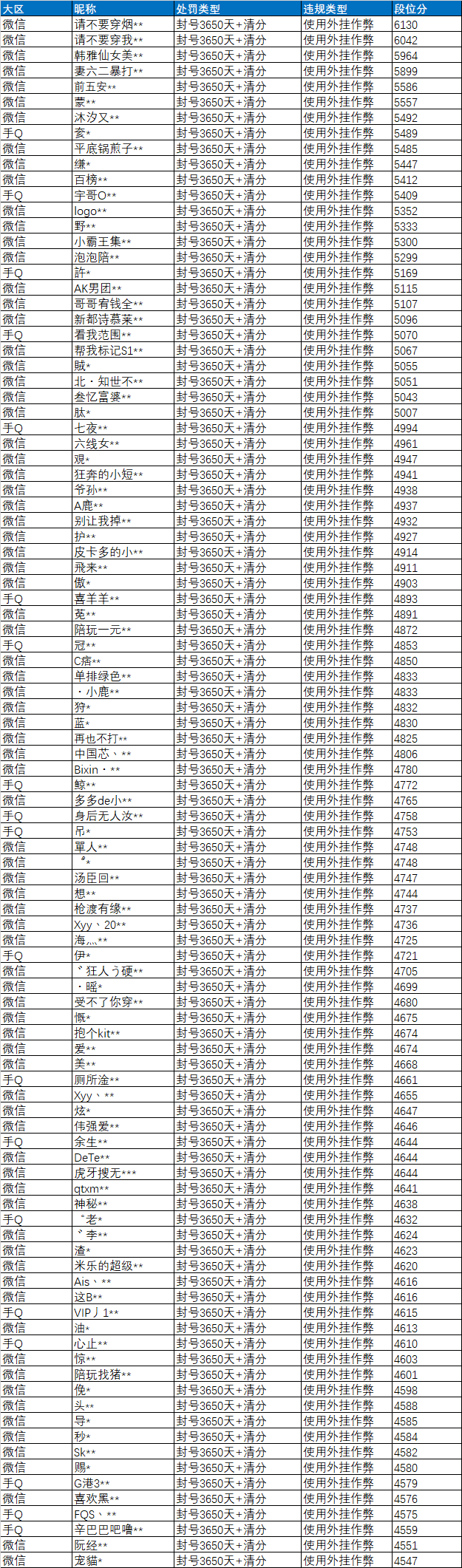 近期部分使用外挂违规特种兵名单: