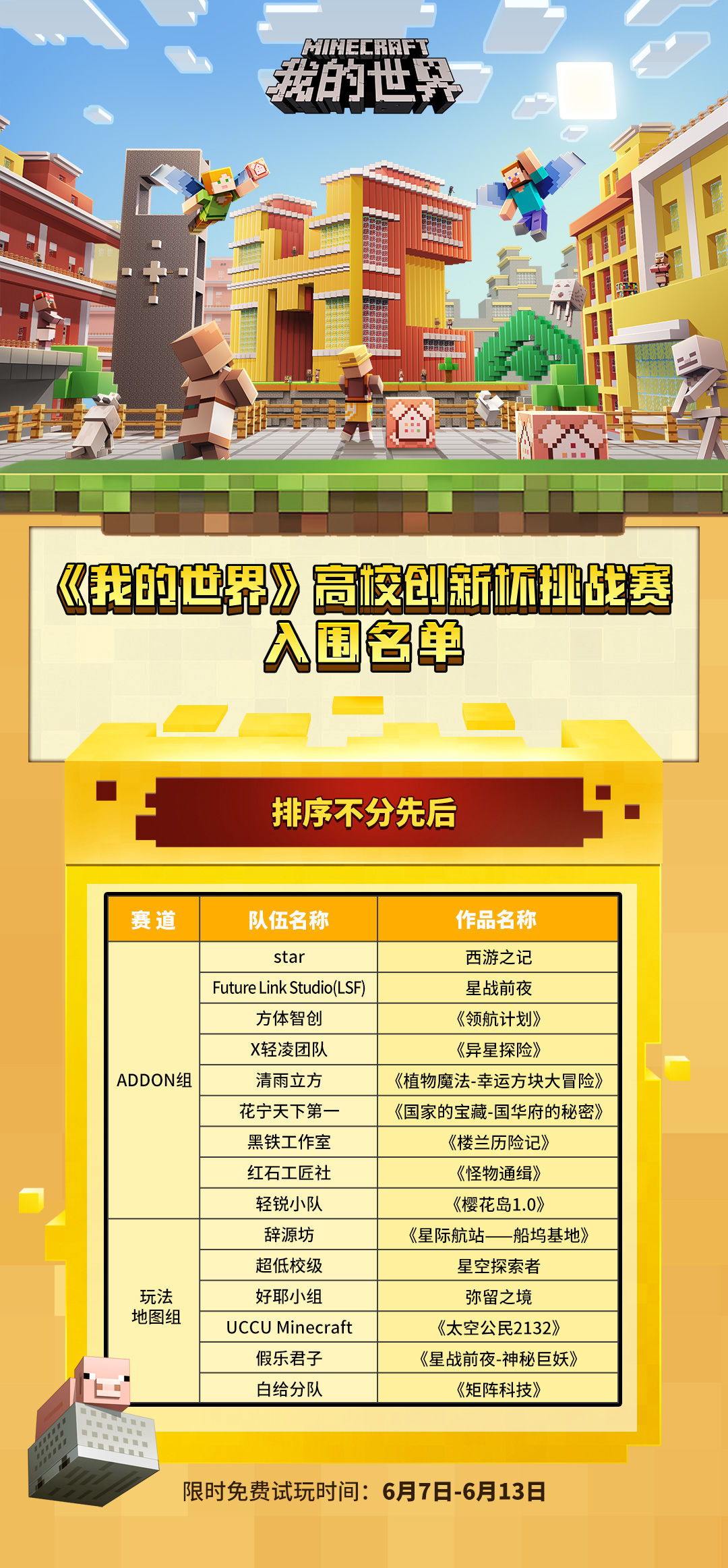 世界在你手中!《我的世界》高校创新杯挑战赛北京赛区正在火热进行中。本次比赛由网易游戏《我的世界》作为主办方,联合中国传媒大学动画与数字艺术学院共同举办,中央美术学院作为支持院校。目前赛事已经进入到紧张激烈的入围阶段,15个最终入围作品正式亮相,创意满满的参赛作品、天马行空的方块世界,各位冒险家们速速来围观吧!入围作品在6月7日-6月13日上架《我的世界》资源中心!最终将根据下载量,评选出最佳人气奖作品!一起戳开长图,看看有哪些惊喜吧~小伙伴们准备好下载组件,pick你喜欢的作品和选手了吗?ヾ(*´▽‘*)ノ